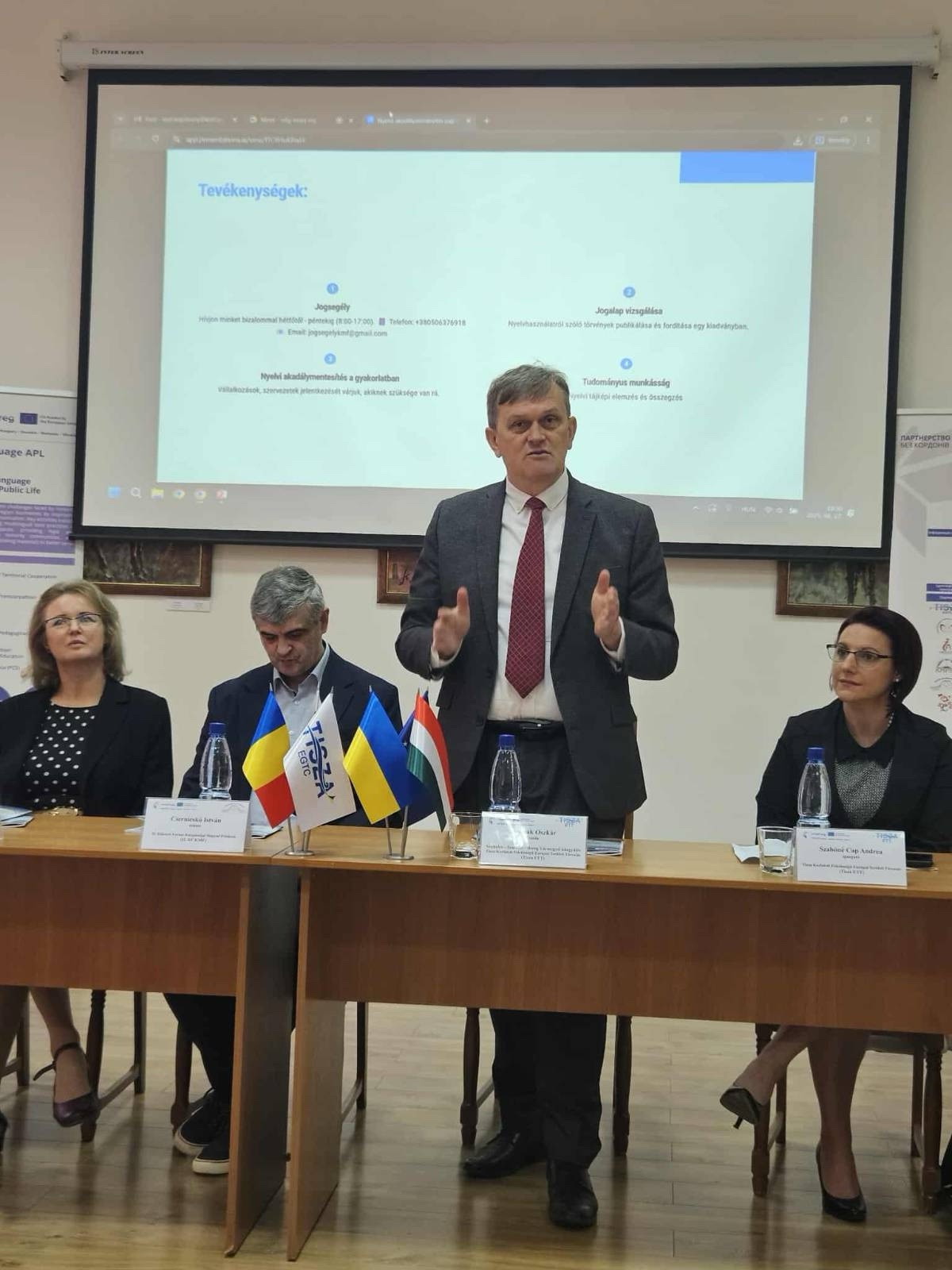 A projekt romániai vonatkozásáról Egri Anett, a Fundaţia Identitás Alapítvány munkatársa számolt be. Őt követte Csernicskó István, a főiskola rektora, aki a projekt ukrajnai, kárpátaljai részét ismertette, bemutatva a Nyelvhasználati kézikönyv (Ukrajna) című kiadványt is. Előadásában felhívta a figyelmet Ukrajna hatályos törvényeire, melyek értelmében Ukrajna kötelezettséget vállalt többek között arra is, hogy elősegíti és támogatja a kisebbségi nyelvek használatát az önkormányzatokban, az állam biztosítja a nemzeti kisebbséghez tartozó személyek és a közigazgatási hatóságok közötti kisebbségi nyelv használatát.