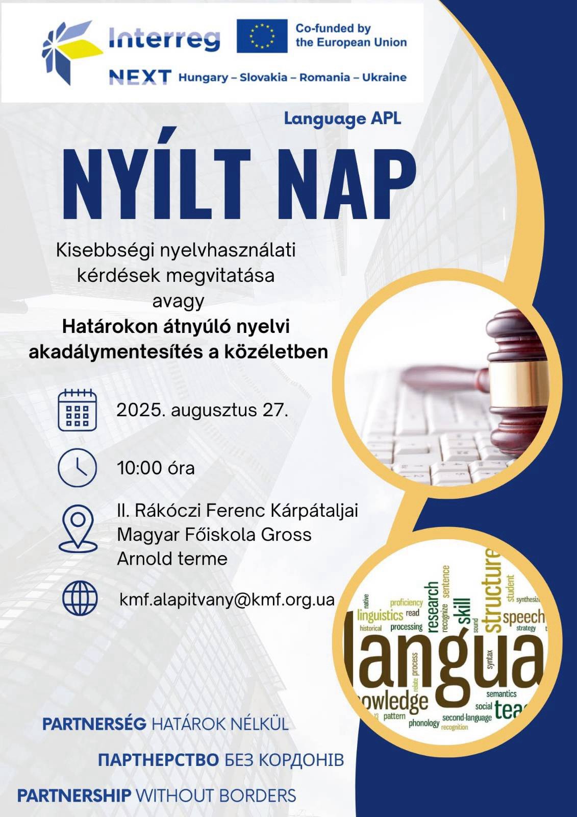 A program résztvevői augusztus 27-én a II. Rákóczi Ferenc Kárpátaljai Magyar Főiskolán nyílt napon ismertették eddig elért eredményeiket. Ahogy a részletekről az intézmény tudósítása beszámol: a jelenlévőket Tóth Tünde, a KMF JA igazgatója köszöntötte. Többek között szó esett arról, hogy a nyelvi akadálymentesítés igyekszik egyenlő feltételeket teremteni az embereknek ahhoz, hogy szabadon élhessenek a jogaikkal.